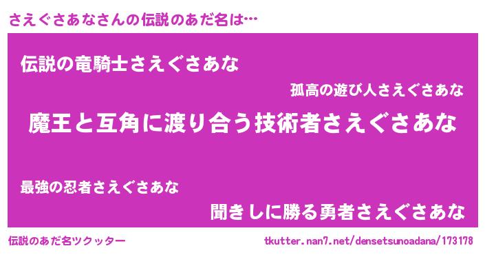 | 意味不明あだ名 | 『住所不定無職さえぐさあな(5歳)』 |