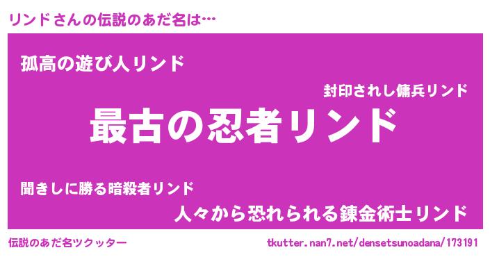 | 男性向けラノベタイトル風あだ名 | 『リンドに滅ぼされるだけの簡単なお仕事です』 |