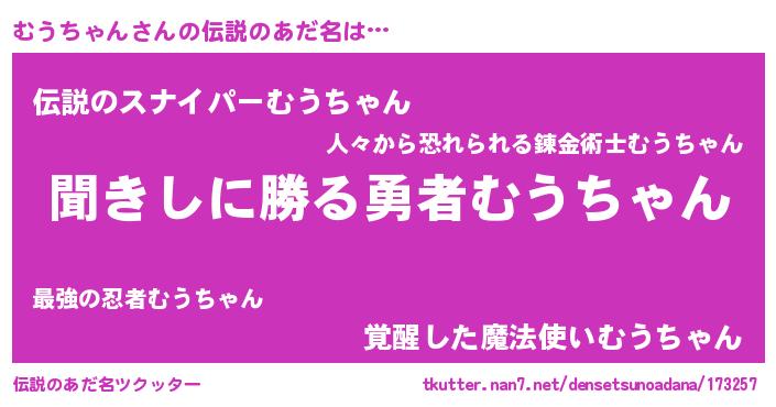 | 女子向けラノベタイトル風あだ名 | 『異世界で失敗しない100のむうちゃん』 |