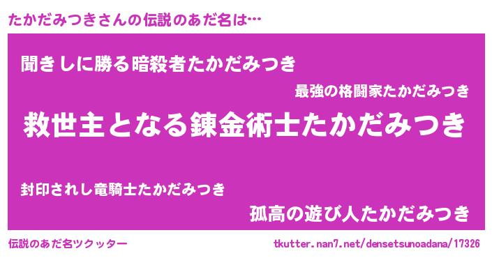 | 男性向けラノベタイトル風あだ名 | 『たかだみつきに滅ぼされるだけの簡単なお仕事です』 |