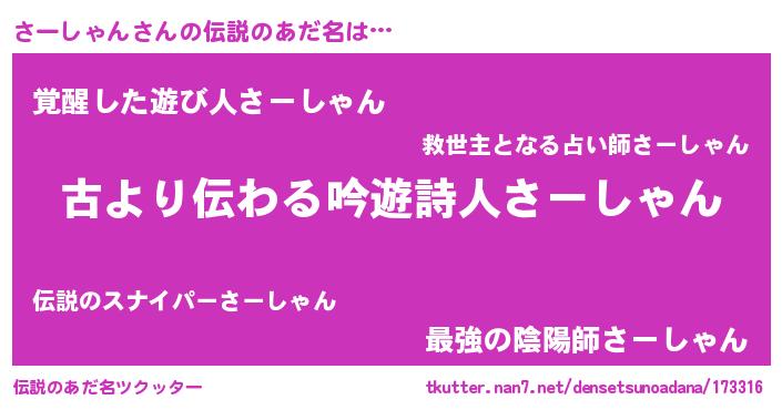 | 男性向けラノベタイトル風あだ名 | 『さーしゃんという概念が存在しない退屈な世界 』 |