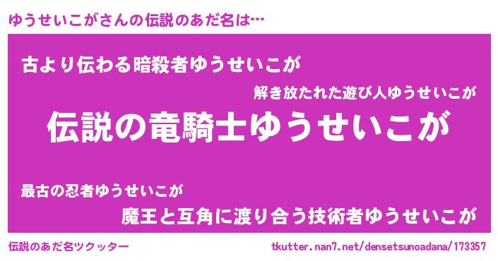 | ヒーロー風カッコイイあだ名 | 『スーパーユウセイコガ』『仮面ユウダー』 |