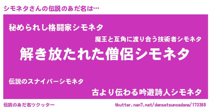 | ヒーロー風カッコイイあだ名 | 『銀牙騎士シモ』『ウルトラシモネタマン』 |