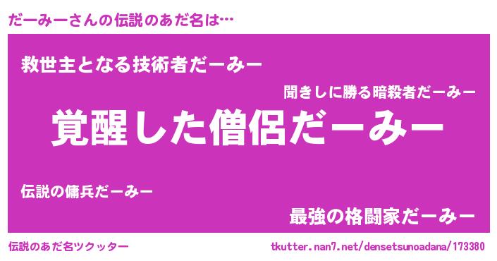 | 男性向けラノベタイトル風あだ名 | 『だーみーの嫁は女の子じゃないと思った?』 |