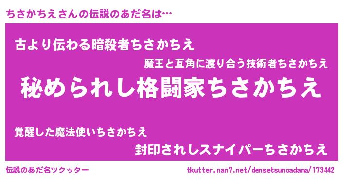 | 意味不明あだ名 | 『住所不定無職ちさかちえ(7歳)』 |