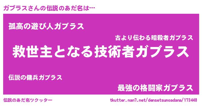 | 男性向けラノベタイトル風あだ名 | 『この素晴らしい世界にガブラスを!』 |