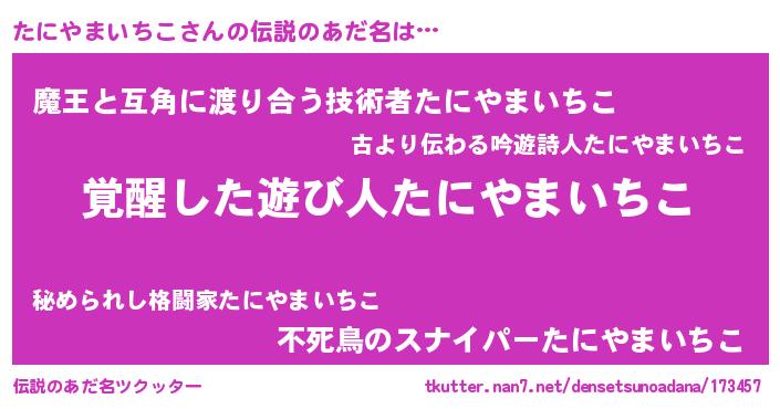 | 男性向けラノベタイトル風あだ名 | 『たにやまいちこの嫁は女の子じゃないと思った?』 |