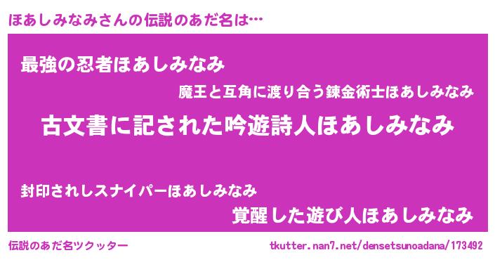 | 意味不明あだ名 | 『自称ほあしみなみ』 |