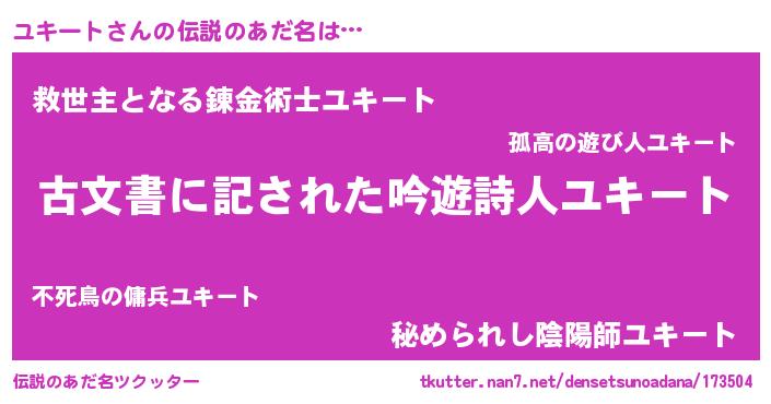 | 男性向けラノベタイトル風あだ名 | 『Re:ユキートから始める異世界生活』 |