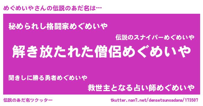 | 意味不明あだ名 | 『自称めぐめいや』 |
