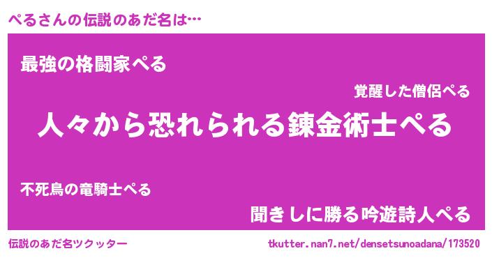 | 男性向けラノベタイトル風あだ名 | 『魔法科高校のぺる』『ペルスレイヤー』 |