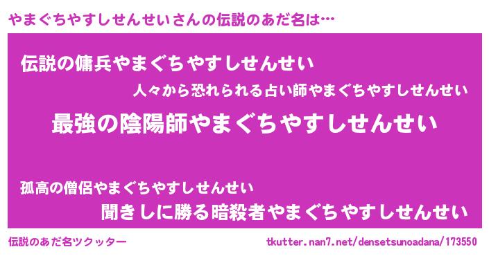 | 意味不明あだ名 | 『住所不定無職やまぐちやすしせんせい(79歳)』 |