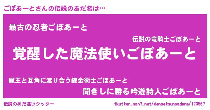 | 男性向けラノベタイトル風あだ名 | 『ごぼあーとの嫁は女の子じゃないと思った?』 |