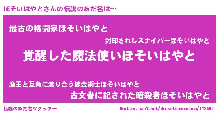 | 男性向けラノベタイトル風あだ名 | 『ほそいはやとの嫁は女の子じゃないと思った?』 |