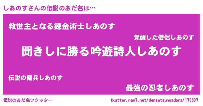 | 女子向けラノベタイトル風あだ名 | 『しあのすが死なない童話 林檎のしあのすの診療簿』 |