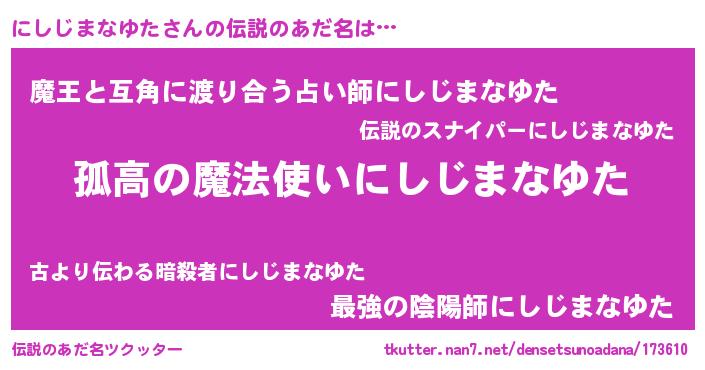 | 意味不明あだ名 | 『とにかく怪しいにしじまなゆた』 |