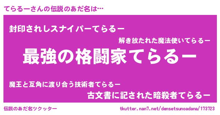 | 意味不明あだ名 | 『ニラ科てらるー属』『自称てらるー』 |