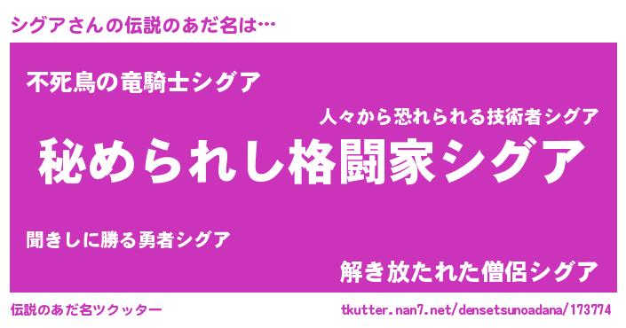 | 意味不明あだ名 | 『自称シグア』『なめこ科シグア属』 |