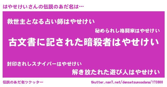 | 意味不明あだ名 | 『自称はやせけい』『永久保存はやせけい』 |