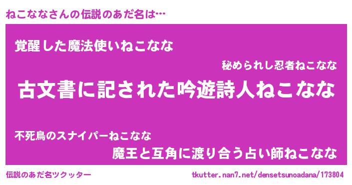 | 男性向けラノベタイトル風あだ名 | 『ねこなな~年齢イコール彼女いない歴の魔法使い~』 |