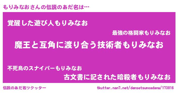 | 男性向けラノベタイトル風あだ名 | 『もりみなおに滅ぼされるだけの簡単なお仕事です』 |