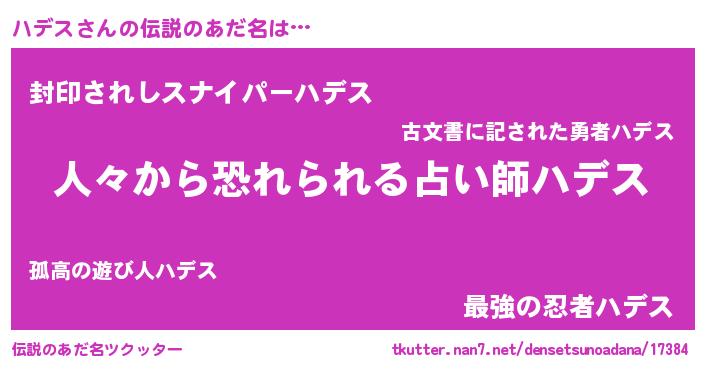 | ヒーロー風カッコイイあだ名 | 『仮面ハデダー』『最強戦士ハデス』 |