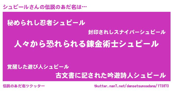 | ヒーロー風カッコイイあだ名 | 『正義の使者シュピール』『天弓騎士シュ』 |