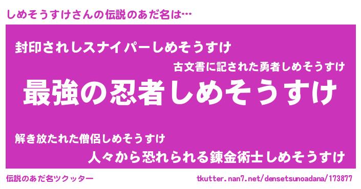 | 男性向けラノベタイトル風あだ名 | 『しめそうすけに滅ぼされるだけの簡単なお仕事です』 |