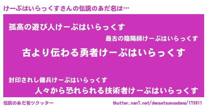 | 胡散臭い通販商品みたいなあだ名 | 『来世でも幸せになれる水素水…その名も「けーぷはいらっくす」』 |