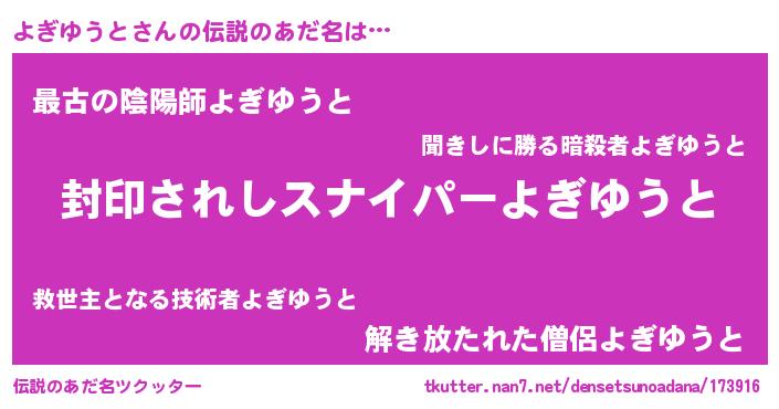 | ファンタジー風あだ名 | 『ヨギフェル』『エターナルヨギユウトー』 |