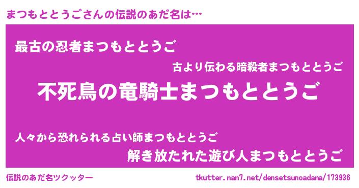 女子向けラノベタイトル風あだ名 | 『まつもととうご姫と円卓の騎士』 |