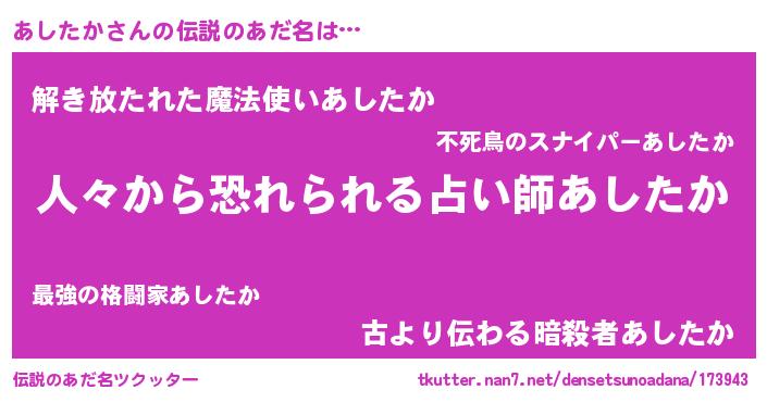 | 男性向けラノベタイトル風あだ名 | 『緋弾のアシタカ』『魔弾の王とあしたか』 |