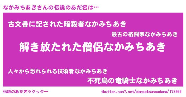 | 男性向けラノベタイトル風あだ名 | 『ダンジョンになかみちあきを求めるのは間違っているだろうか』 |
