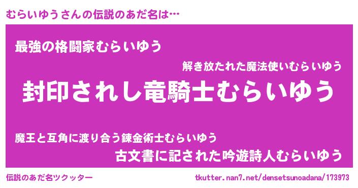 | 男性向けラノベタイトル風あだ名 | 『この素晴らしい世界にむらいゆうを!』 |