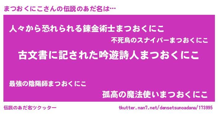 | 男性向けラノベタイトル風あだ名 | 『この素晴らしい世界にまつおくにこを!』 |