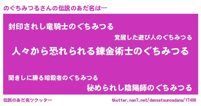 | 女子向けラノベタイトル風あだ名 | 『のぐちみつるが死なない童話 林檎ののぐちみつるの診療簿』 |