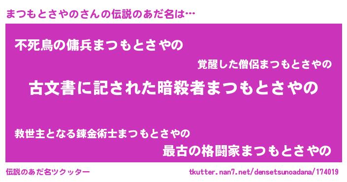 | 男性向けラノベタイトル風あだ名 | 『まつもとさやのに滅ぼされるだけの簡単なお仕事です』 |
