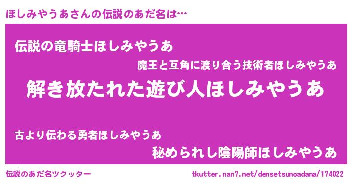 | 肩書あだ名 | 『ほしみやうあ中将』『ほしみやうあ団長』 |
