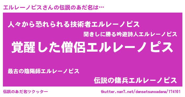 | 男性向けラノベタイトル風あだ名 | 『エルレーノピスの嫁は女の子じゃないと思った?』 |