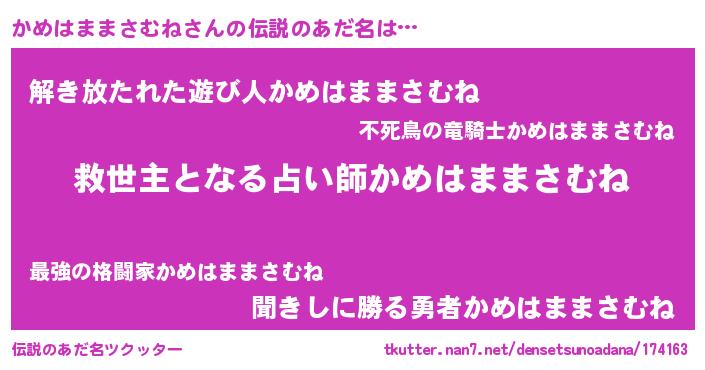 | 男性向けラノベタイトル風あだ名 | 『かめはままさむねに滅ぼされるだけの簡単なお仕事です』 |