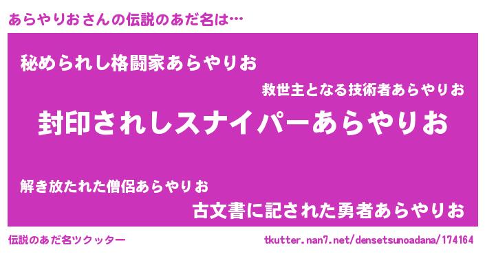 | 胡散臭い通販商品みたいなあだ名 | 『億万長者になれる霊験あらたかなお札…その名も「あらやりお」』 |