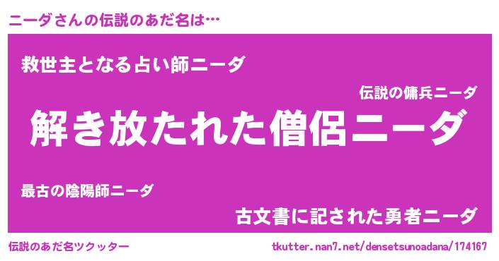 | ヒーロー風カッコイイあだ名 | 『仮面ニーダー』『究極戦士ニーダ』 |