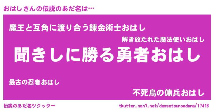 | 意味不明あだ名 | 『めかぶ科おはし属』『自称おはし』 |