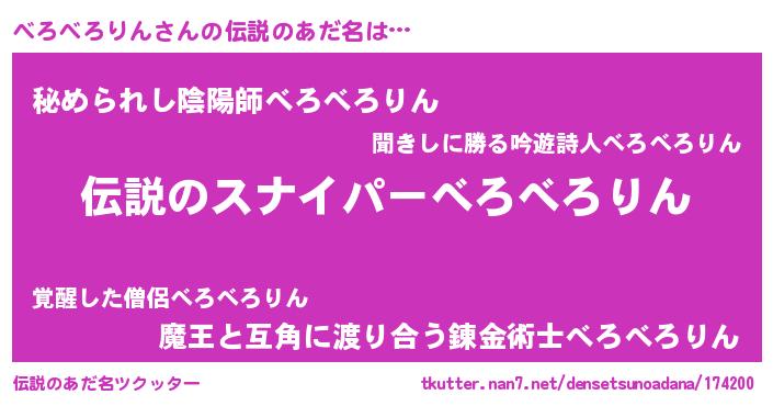 | 女子向けラノベタイトル風あだ名 | 『(仮)べろべろりんのやんごとなき事情』 |