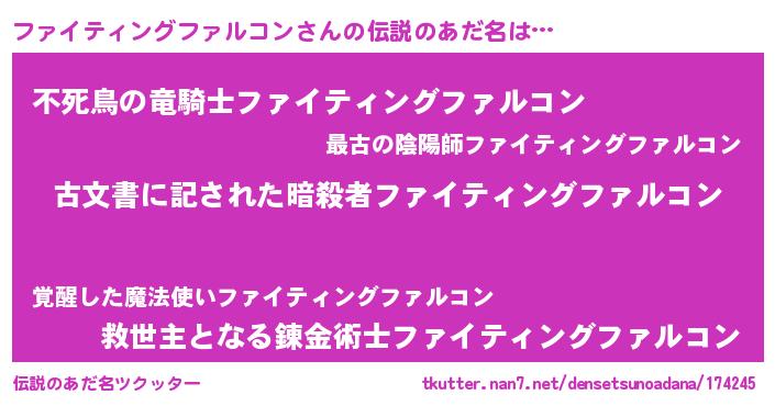 | 男性向けラノベタイトル風あだ名 | 『誰もが恐れるあのファイティングファルコンが、ぼくの専属メイドになるようです。』 |