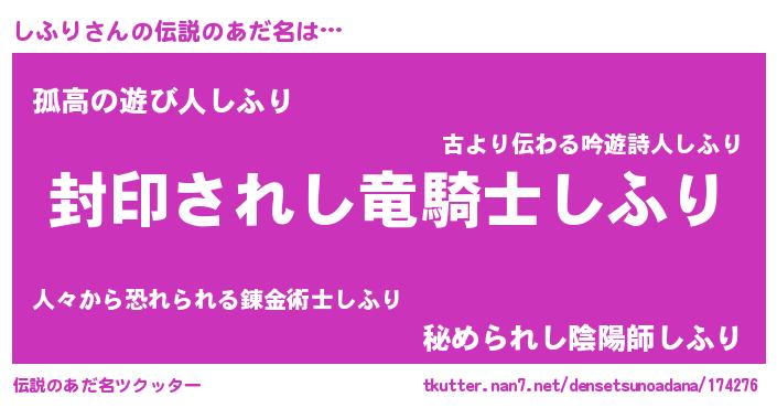 | ヘコむあだ名 | 『しふにー』『しふぷりん』『つくし』 |