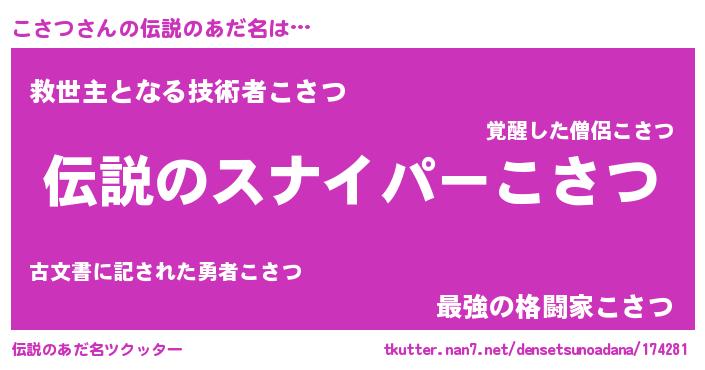 | 男性向けラノベタイトル風あだ名 | 『コサツスレイヤー』 |
