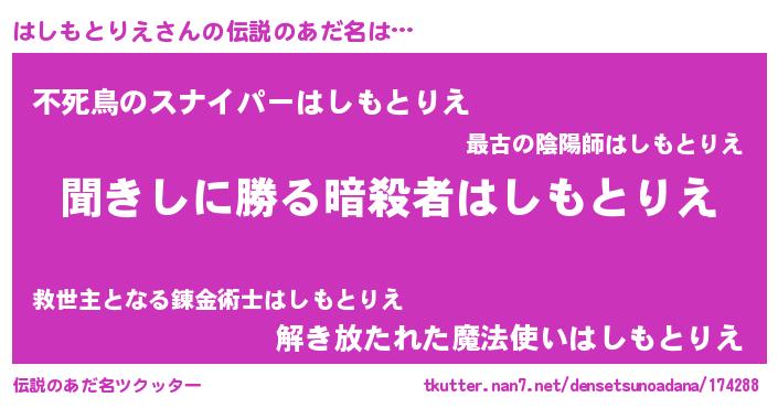 | 男性向けラノベタイトル風あだ名 | 『はしもとりえという概念が存在しない退屈な世界 』 |