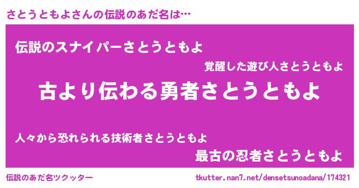 | ヘコむあだ名 | 『さとうともよ(苦笑)』『さとっふぃ~』 |