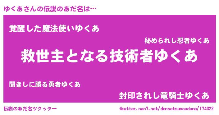 | 女子向けラノベタイトル風あだ名 | 『死神ゆくあの再婚』『ゆくあ様がみてる』 |